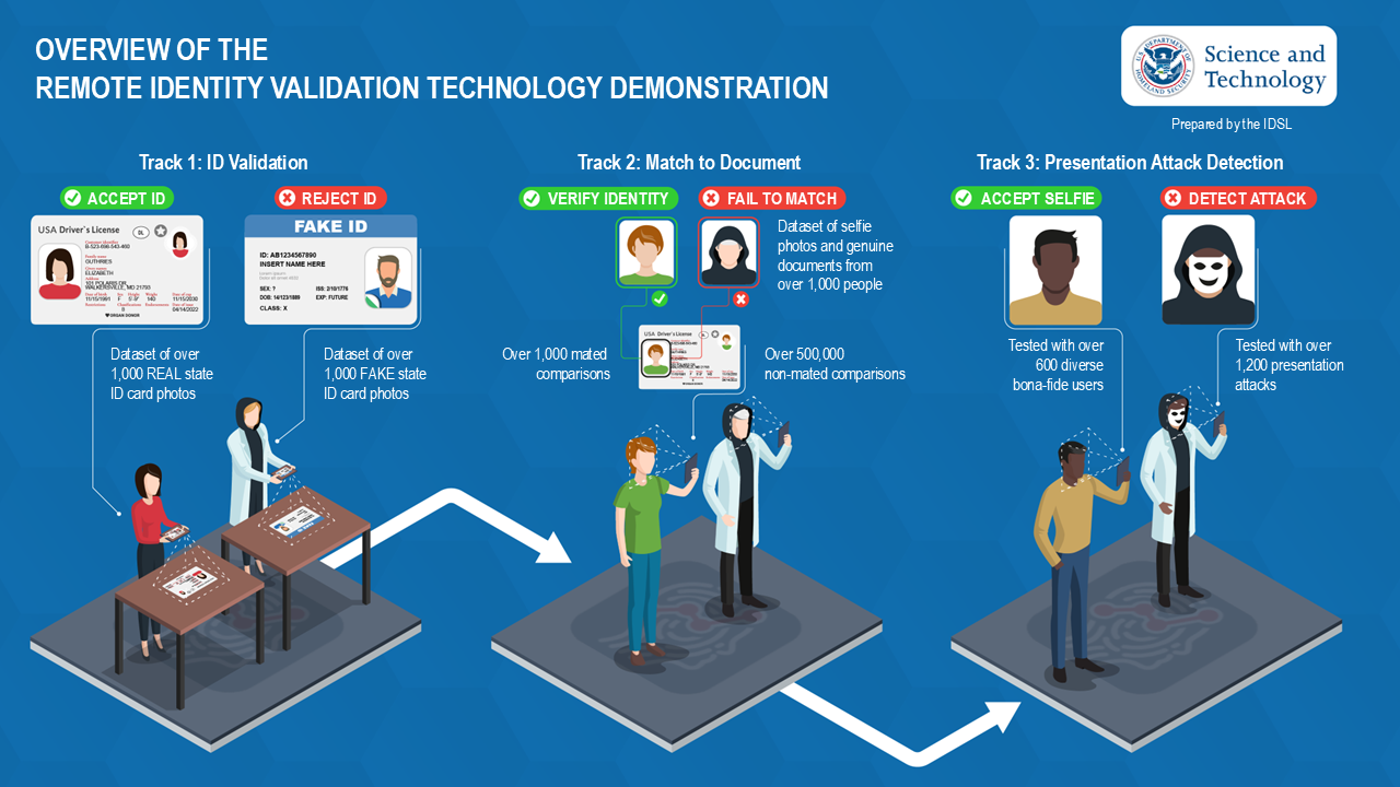 The RIVTD was divided into three tracks, for three different steps in the remote identity validation process. The first track, document validation, tested systems that determine if an ID is genuine or not. The second track, match to document, tested systems that determine if a person in a selfie is the same person pictured on an ID document. The third track, presentation attack detection, tested subsystems that determine if a presentation is from a legitimate or fraudulent user, like someone using a mask to impersonate someone.