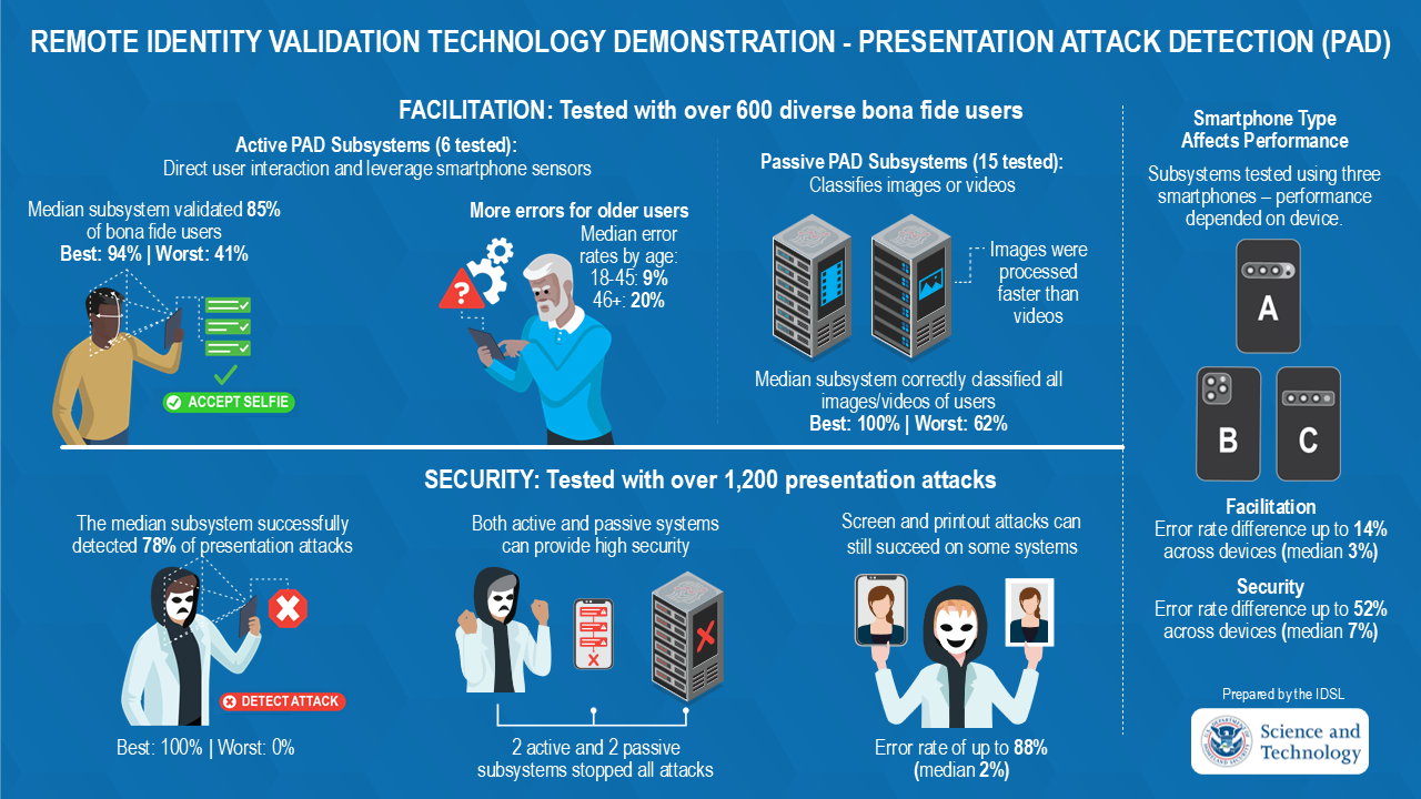 The Remote Identity Validation Technology Demonstration (RIVTD): Face Liveness (API: Passive PAD System) demonstrated the current capabilities of industry solutions for detecting presentation attacks, which are malicious attempts to deceive identity verification systems using photos, videos, masks, or other instruments. As part of the demonstration, presentation attack detection (PAD) subsystems were tasked with detecting presentation attacks without sacrificing user convenience for a diverse group of 660 people.